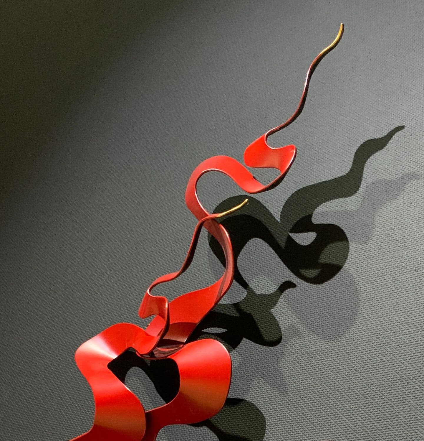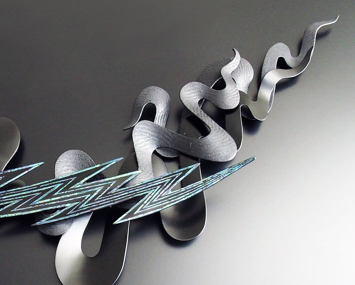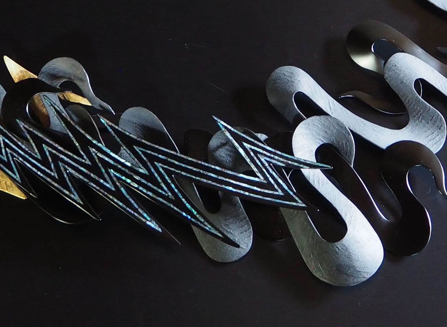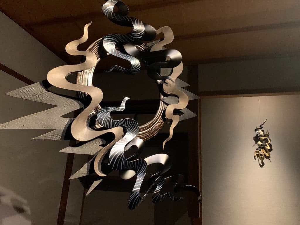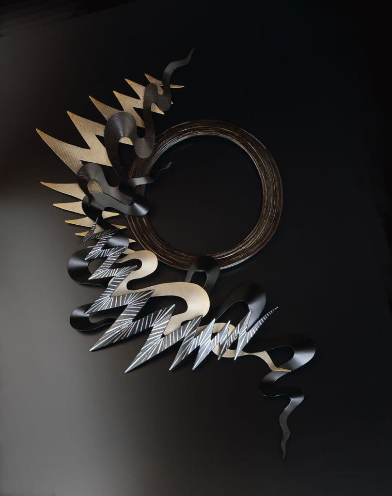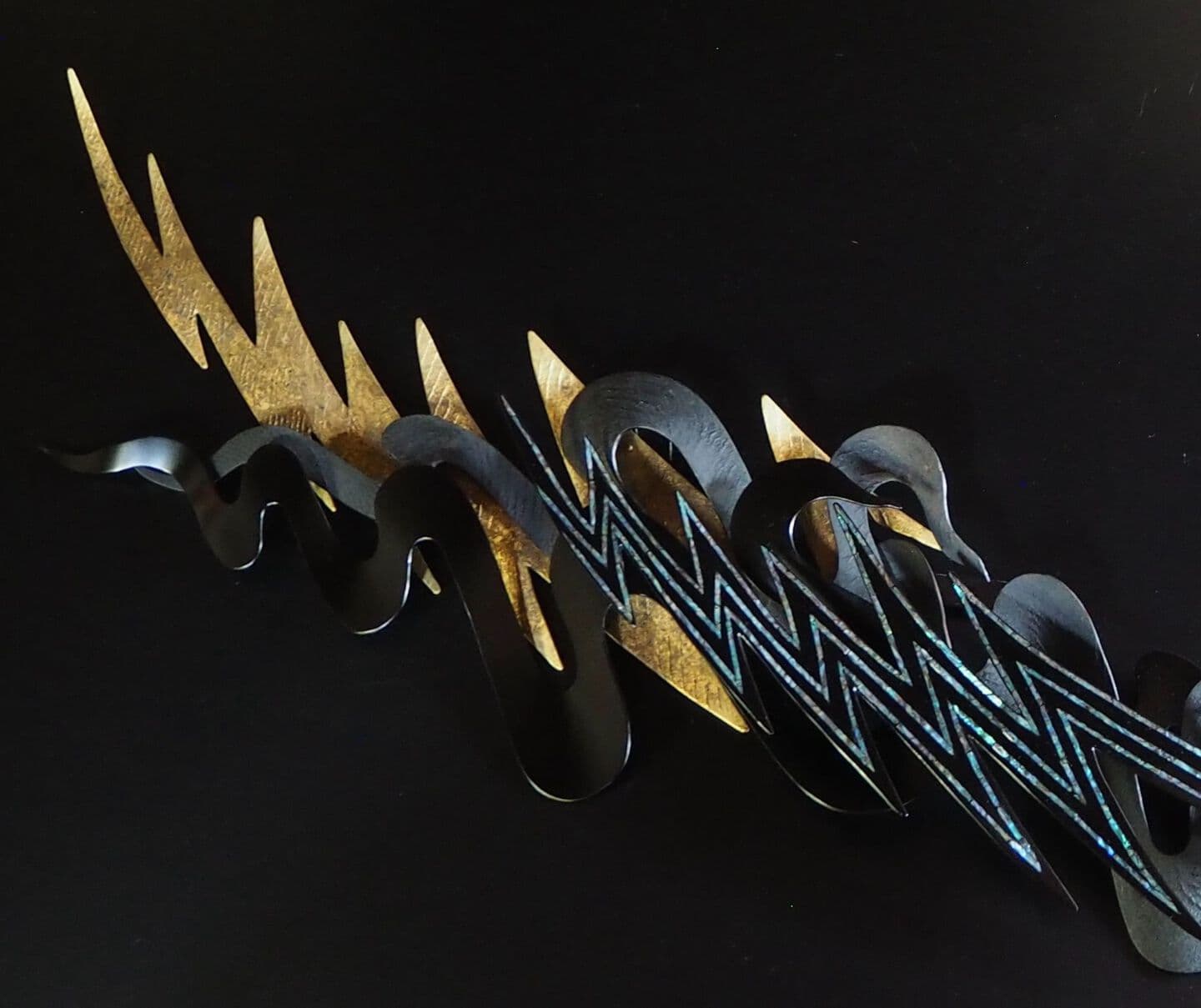 This work is wall a sculpture made by the combining of kanshitsu parts. The base shapes are made of kanshitsu and the surface decoration is textured with urushi undercoating paste with tinted silver foil (銀箔), tin and gold powder. All my works are about the possibilities of kanshitsu, the freedom, lightness, and potential of the material.
